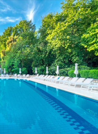 Our main pool is one of the largest in Skiathos, surrounded by pine trees and soft island light. A lifeguard is on duty 10:00–18:00, while a smaller children’s pool makes it perfect for families.